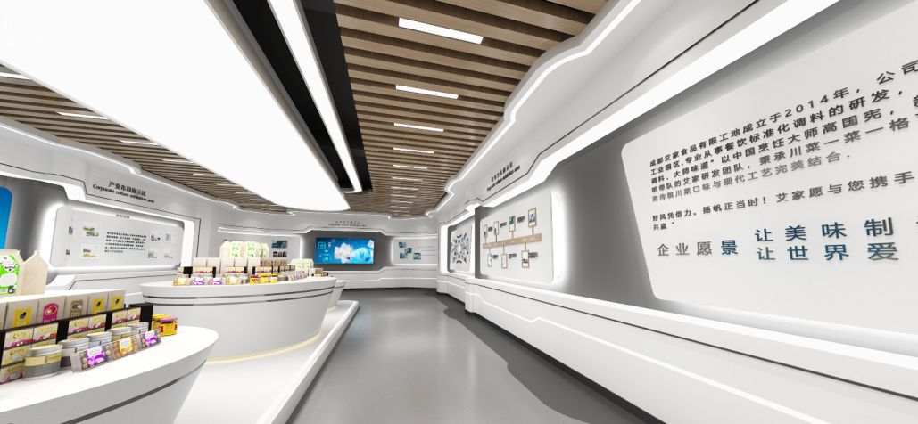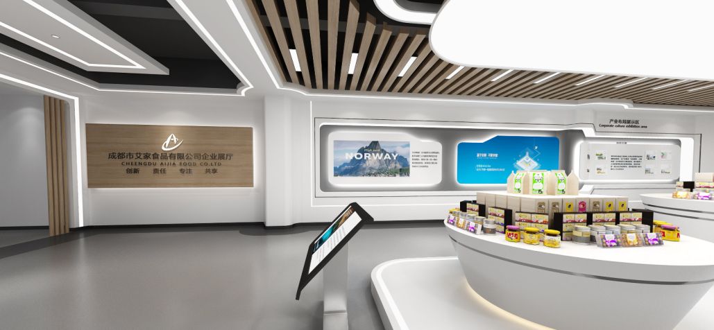 設(shè)計思路:展館以簡約現(xiàn)代的設(shè)計風(fēng)格為主,突出產(chǎn)品的質(zhì)感與美感。通過巧妙的展示布局與創(chuàng)意裝飾,讓參觀者在輕松愉悅的氛圍中了解并愛上艾家食品。