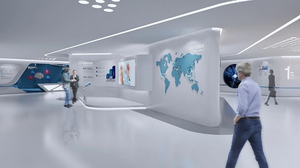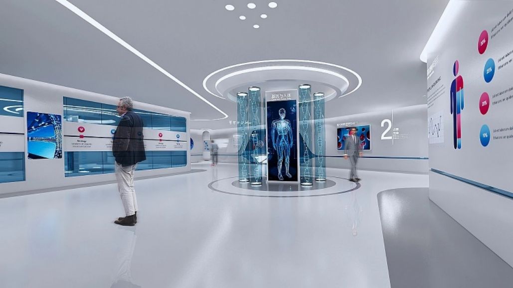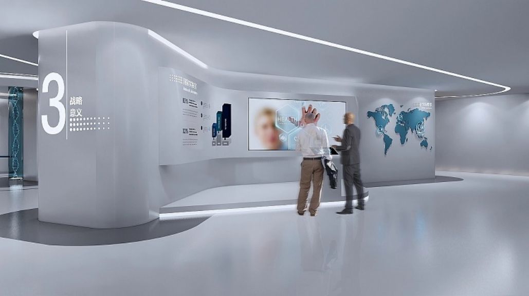 城市:山東菏澤,時(shí)間:2020年6月-9月。設(shè)計(jì)理念:展廳布局簡(jiǎn)潔,白色為主,藍(lán)色點(diǎn)綴,聲光電演繹生命奧秘,展示企業(yè)細(xì)胞生命科技實(shí)力。