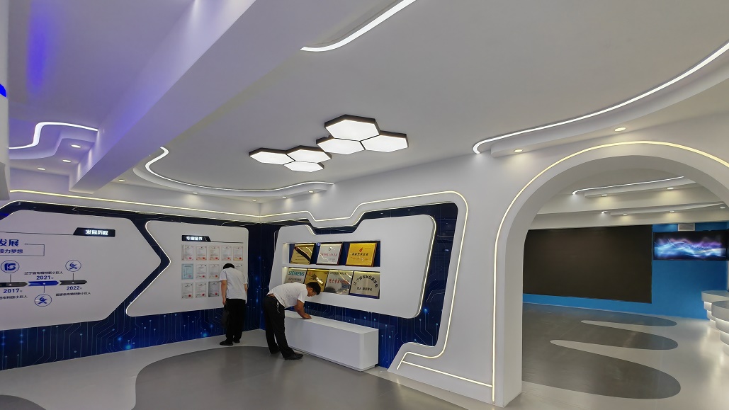 城市:遼寧沈陽(yáng),時(shí)間:2022年8月-10月。設(shè)計(jì)理念:展廳巧妙運(yùn)用白色與藍(lán)色,布局有序,聲光電演繹企業(yè)文化,彰顯企業(yè)實(shí)力與擔(dān)當(dāng)
