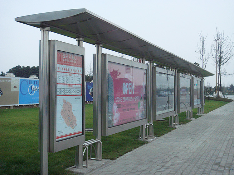 公交車候車亭一般是與公交站牌相配套的,為方便公交乘客候車時遮陽、防雨等,在車站、道路兩旁或綠化帶的港灣式公交停靠站上建設的交通設施。由于城市公交的日益發達,候車亭已發展成為城市一個不可或缺的重要組成部分,設計精美的候車亭也成為了城市一道美麗的風景。 一般候車亭棚體主要頂棚、立柱、頂弓、廣告燈箱和坐凳組成,也有用隔板來代替廣告燈箱的。