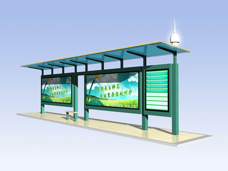公交車候車亭一般是與公交站牌相配套的,為方便公交乘客候車時遮陽、防雨等,在車站、道路兩旁或綠化帶的港灣式公交停靠站上建設的交通設施。由于城市公交的日益發達,候車亭已發展成為城市一個不可或缺的重要組成部分,設計精美的候車亭也成為了城市一道美麗的風景。 一般候車亭棚體主要頂棚、立柱、頂弓、廣告燈箱和坐凳組成,也有用隔板來代替廣告燈箱的。