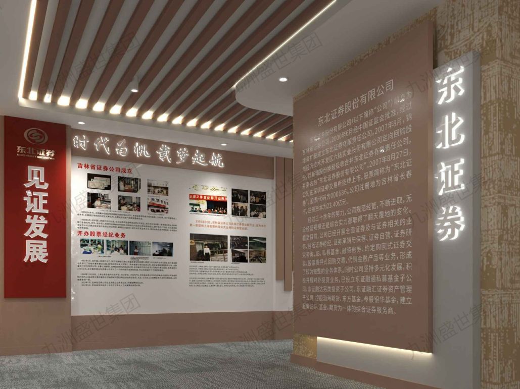 設(shè)計(jì)思路:選用咖啡色為主色調(diào),營造沉穩(wěn)而專業(yè)的氛圍,彰顯證券公司的穩(wěn)健與信賴。融入金融元素,展示公司業(yè)務(wù)特色與發(fā)展歷程。通過創(chuàng)意布局與展示手法,打造互動體驗(yàn)區(qū),提升參觀者的參與感與認(rèn)同感。