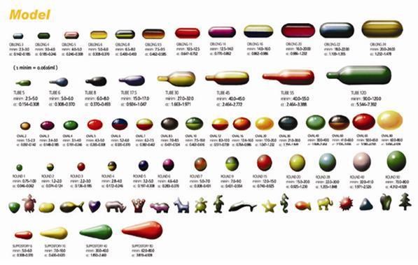 公司配備有50多套摸具,可生產(chǎn)內(nèi)容物裝量從0.1-1.2ml,產(chǎn)品直徑從6-20mm的軟膠囊產(chǎn)品,已有魚(yú)形、圓柱形、滴形、橄欖形、熊仔型等多種形狀,以滿(mǎn)足客戶(hù)對(duì)外形和規(guī)格的不同要求。