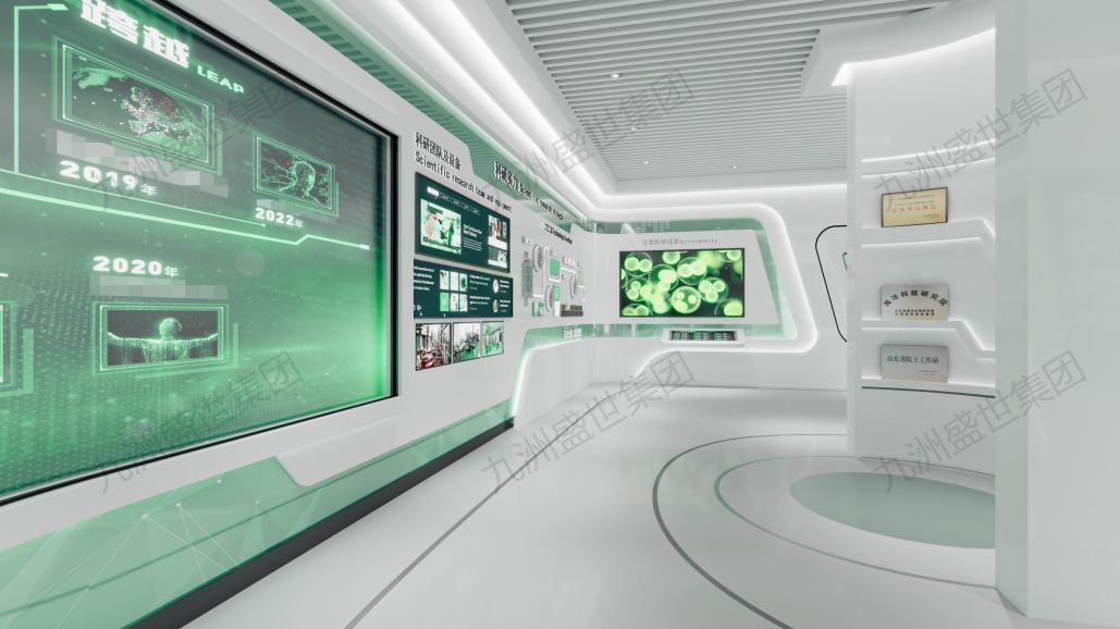 城市:山東濱州,時間:2023年11月-12月。設(shè)計理念:展廳布局清新,白色與綠色交融,聲光電交織,展現(xiàn)生物科技之美,呈現(xiàn)生物科技前沿。