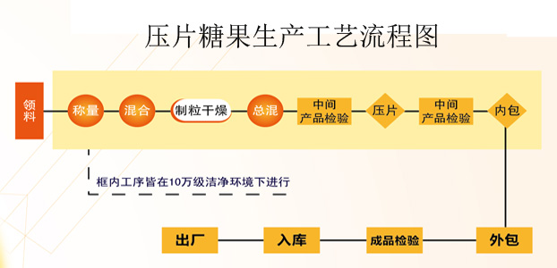 壓片糖果是原料是以白砂糖、粉糖漿(淀或其它食糖)或允許使用的甜味劑,食用色素為主要原料,添加或者不添加食品添加劑(GB2760)或營養強化劑(GB14880),按生產工藝要求加工制成的固態或半固態甜味食品。分為堅實型、夾心型、包衣拋光型三類。執行標準為SB/T 10347。